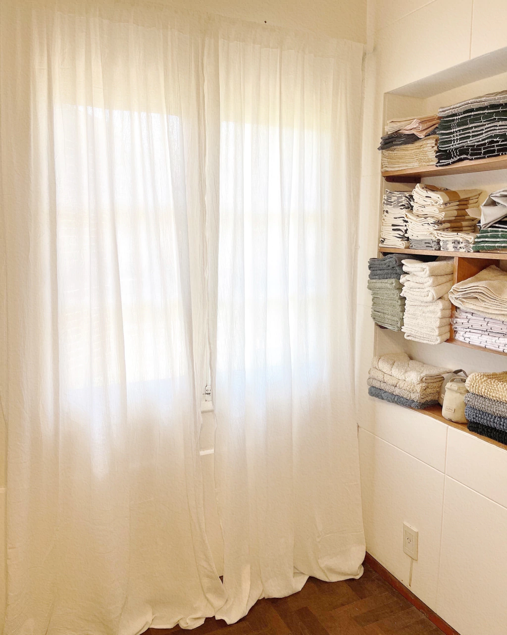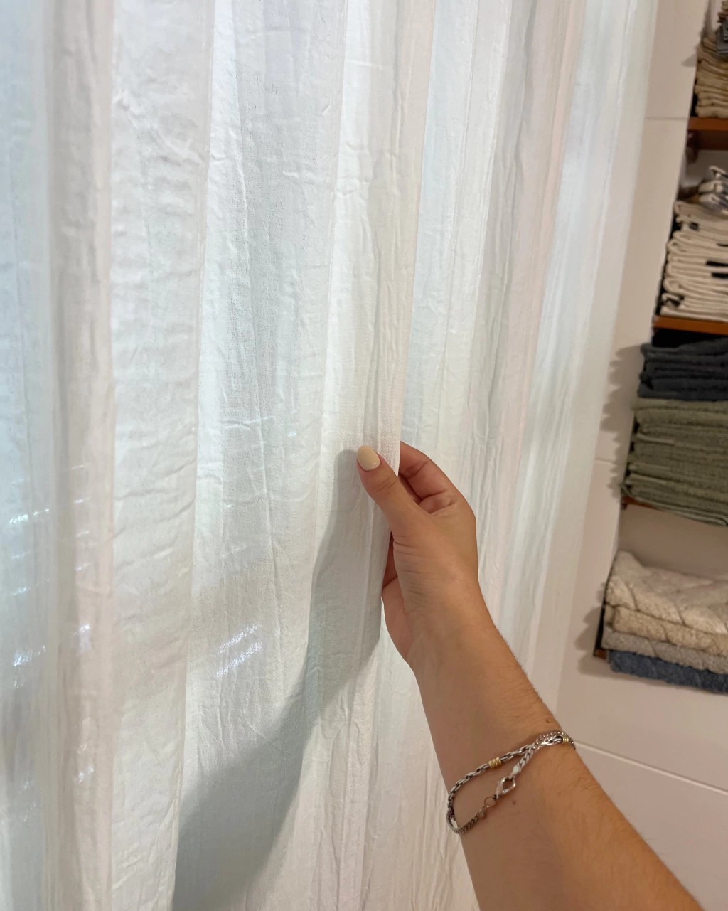 Juego de cortinas Berna confeccionado en gasa arrugada de algodón, ideal para llenar tus espacios de luz y calidez sin perder privacidad. Cada juego incluye 2 paños de 150 cm de ancho por alto seleccionado (medidas aproximadas). Su tejido permite que no se vea hacia adentro, creando un ambiente acogedor y luminoso.